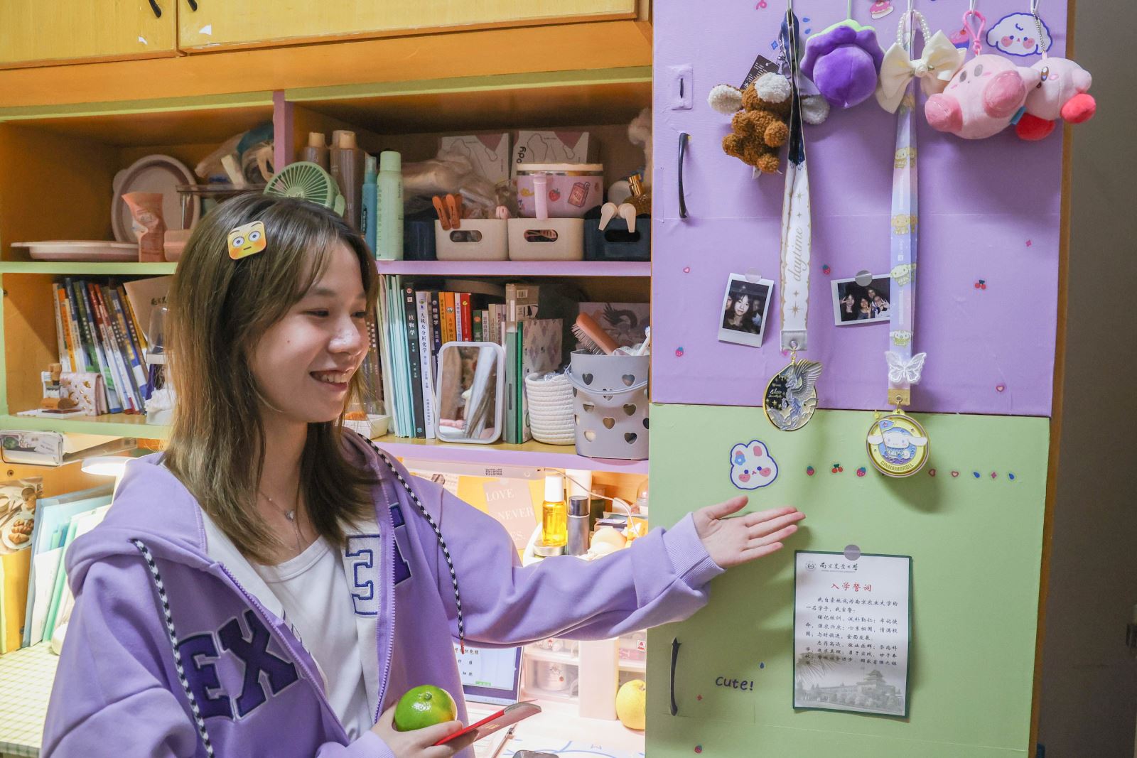 来自4舍122的同学结合自身专业,在宿舍内制作了简易生态缸,学以致用,寓学于乐,将对生物科学的热爱运用到了生活中。8舍621的同学用扭扭棒制作了假花装饰自己的宿舍,为宿舍增添了几分生活气息。8舍614的同学热情地像评委介绍了她们宿舍的宠物玩具狗“moe”,寓意是反对“emo”。8舍619的同学们更是独具慧心——因为每位宿舍成员的名字里都带有“xin”的谐音,四个人的名字中有六个“xin”,故将自己的宿舍命名为“六星级酒店”。