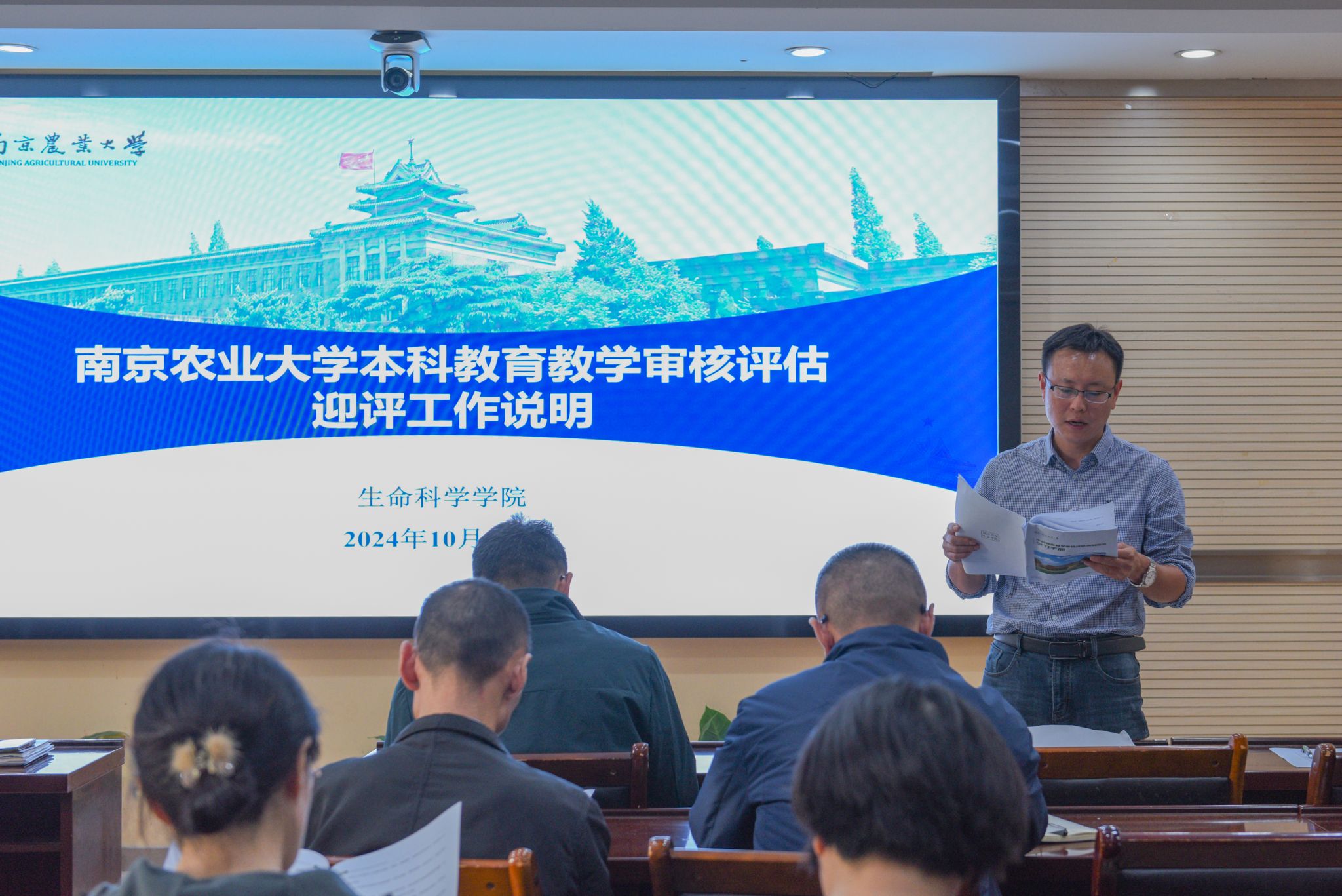 张群从评估常识、校史校情、迎评要点和指标体系四个方面,讲解此次本科教育教学审核评估的细节与部署,从熟知办学理念、抓实课堂学风纪律等方面对迎评工作做了强调。